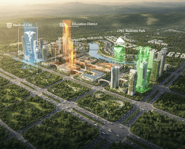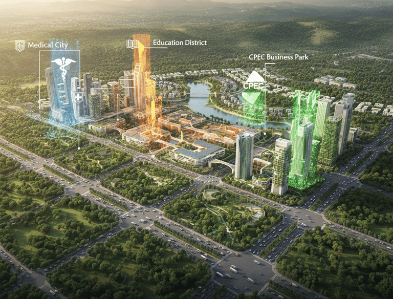 Featuring specialized districts for Health, Education, and the CPEC Business Park.